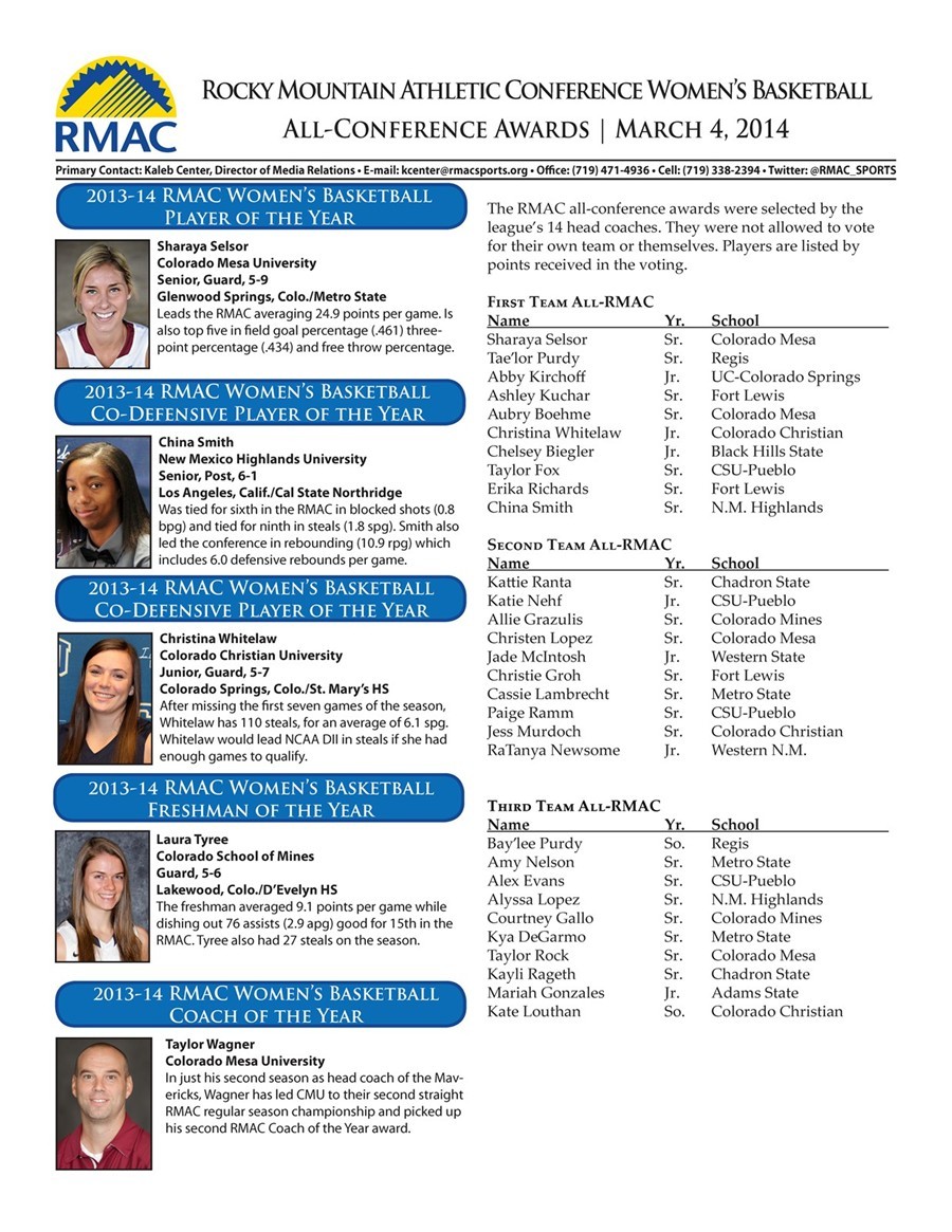 2013-14 RMAC Women's Basketball All-Conference Awards 3/4/2014 2:15:03 PM CLICK ON IMAGE BELOW TO DOWNLOAD PDF RELEASE